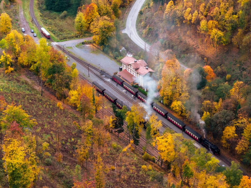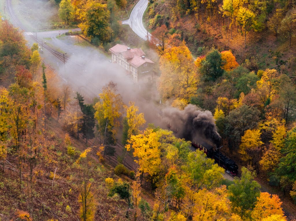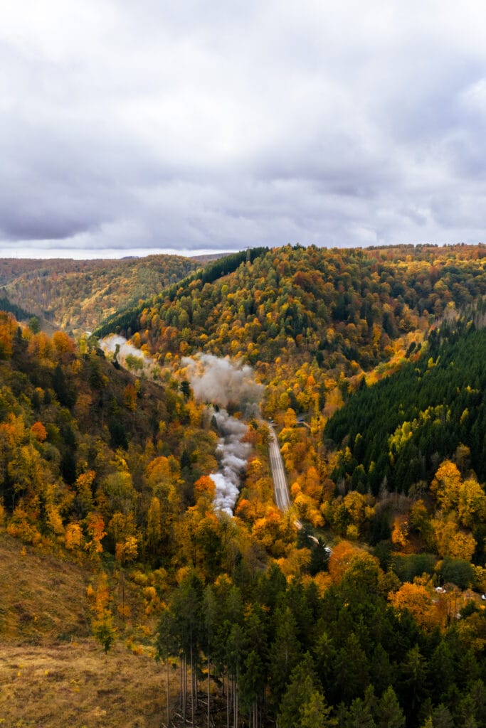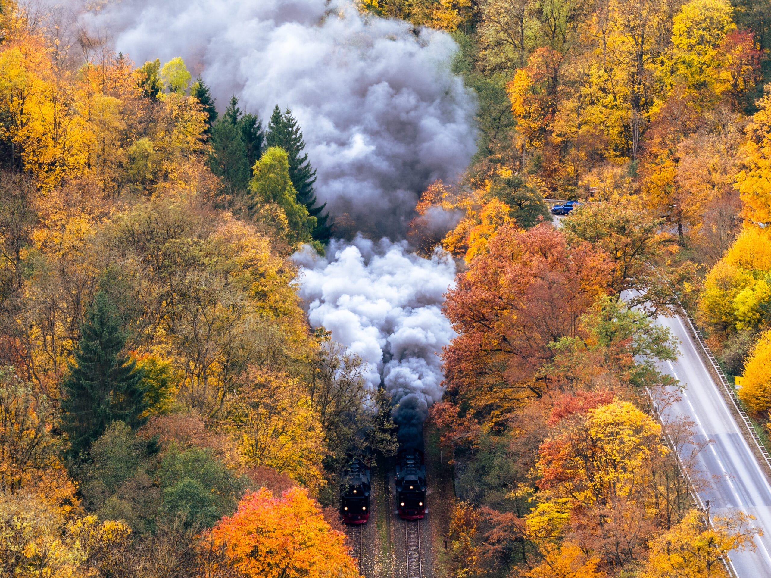 Mit etwas Verspätung stampften 99 7232 und 99 7243 den Hügel hoch nach Hasselfelde und Wernigerode. Der Taupunkt lag günstig, so dass die Ausfahrt von phänomenalen Dampfwolken begleitet wurde, die im Gegensatz zu den Zügen auch weit sichtbar war. Denn auch wenn die herbstlichen Laubbäume den Charme dieser Szenerie ausmachen, so verdecken sie auch den Blick aus der Luft auf die stampfenden Lokomotiven.