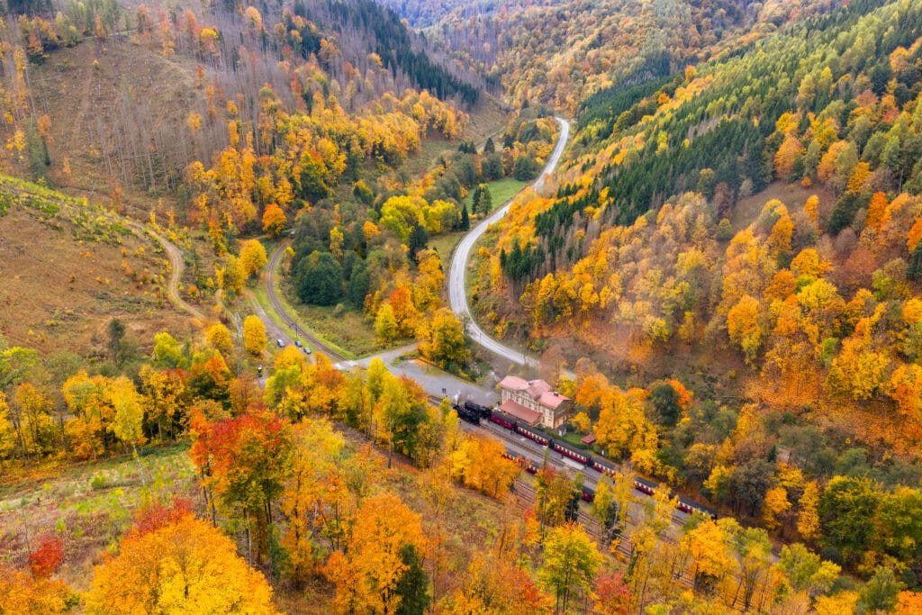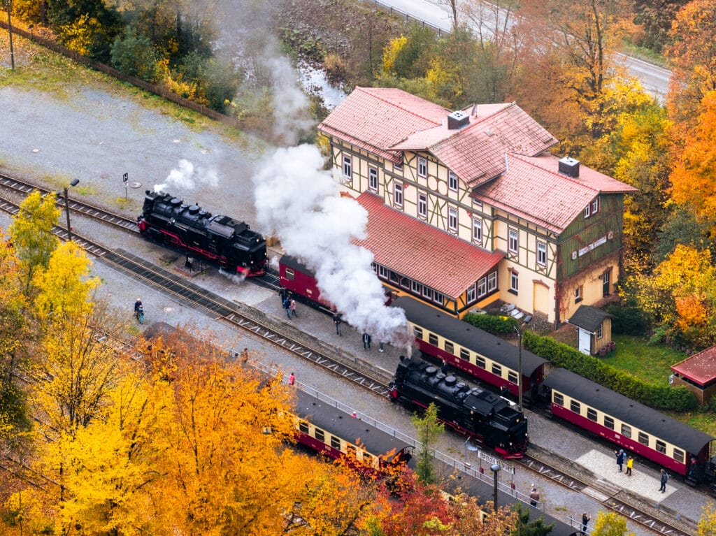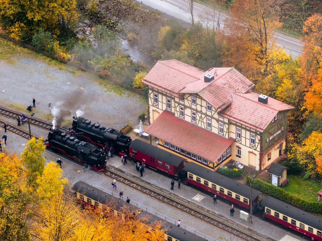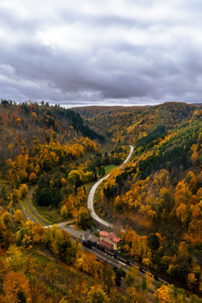 Mit etwas Verspätung stampften 99 7232 und 99 7243 den Hügel hoch nach Hasselfelde und Wernigerode. Der Taupunkt lag günstig, so dass die Ausfahrt von phänomenalen Dampfwolken begleitet wurde, die im Gegensatz zu den Zügen auch weit sichtbar war. Denn auch wenn die herbstlichen Laubbäume den Charme dieser Szenerie ausmachen, so verdecken sie auch den Blick aus der Luft auf die stampfenden Lokomotiven.