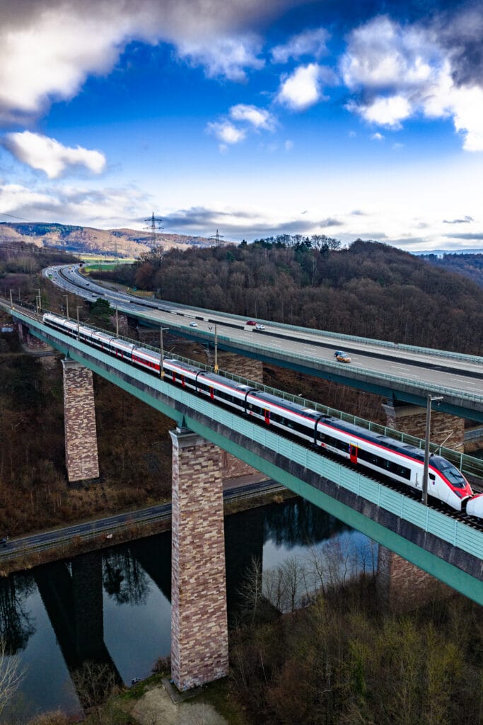 Die Auslöseverzögerung der Drohne machte sich mal wieder bemerkbar, die schönen Züge verstecken sich grundsätzlich hinter Signalen oder Fahrleitungsmasten, die Sonne hielt sich auch lieber bedeckt im Hintergrund, aber immerhin schaute ein bisschen blauer Himmel vorbei.