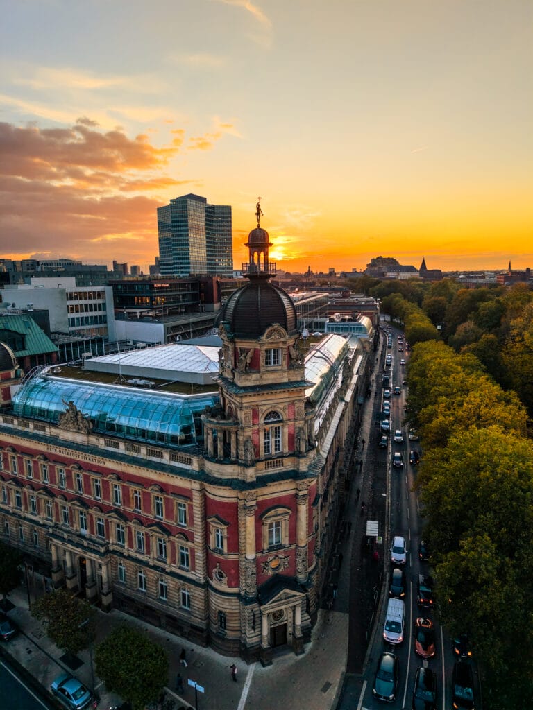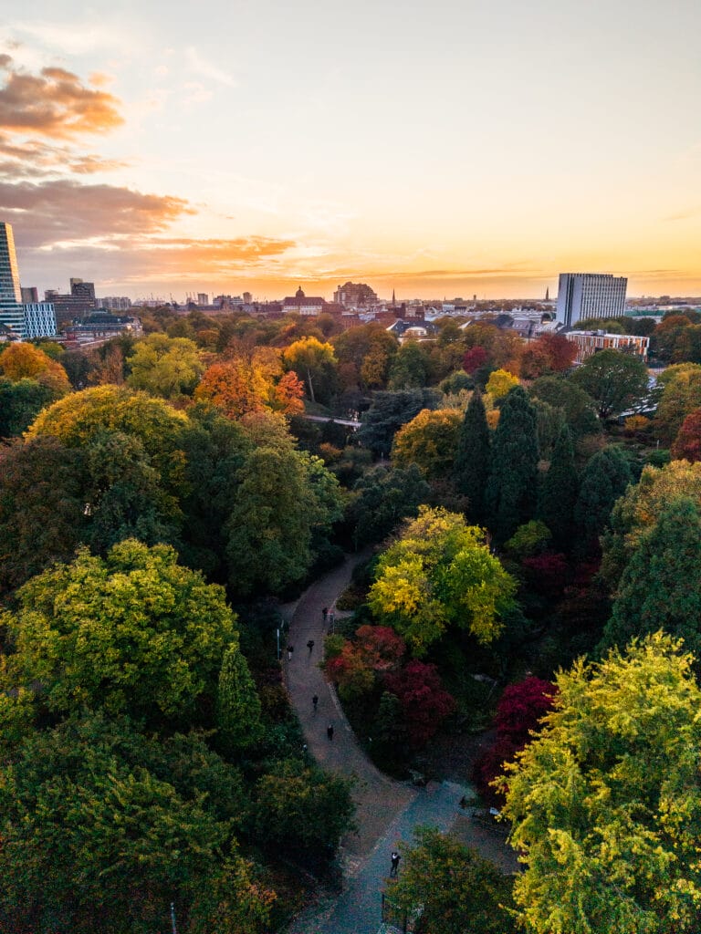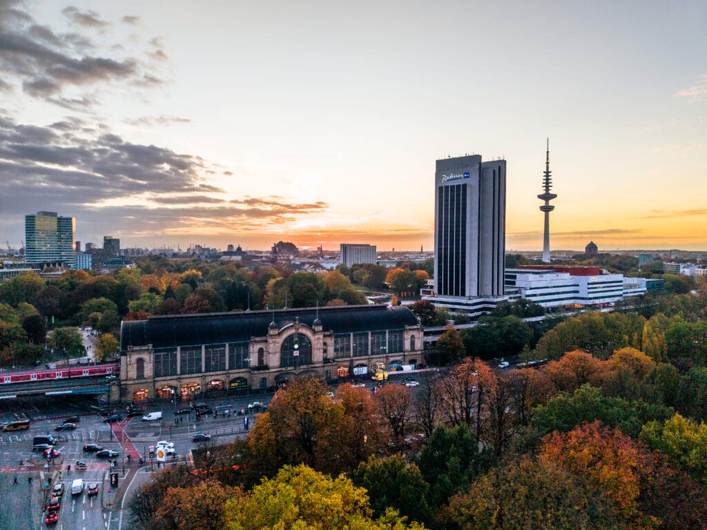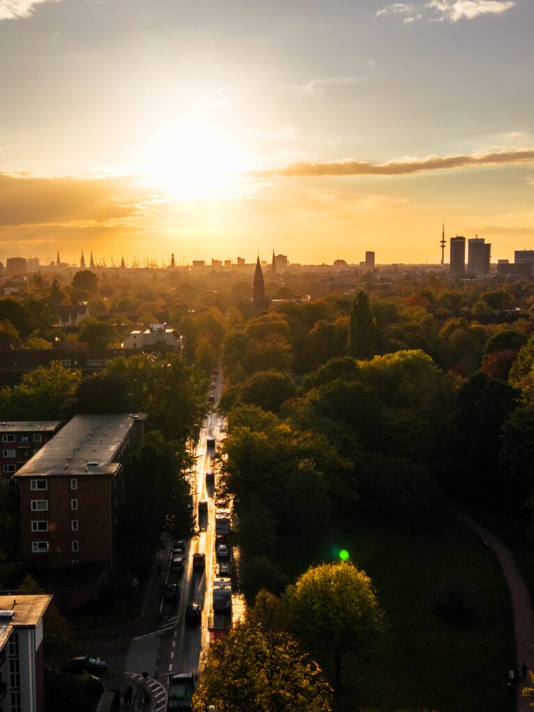 Schon wieder geht ein typischer Hamburger Regentag zu Ende — aber kurz vor Sonnenuntergang riss dann doch noch mal die Regenwolkendecke auf und schenkte der Drohne einen schönen Blick auf einen herbstlichen Sonnenuntergang.