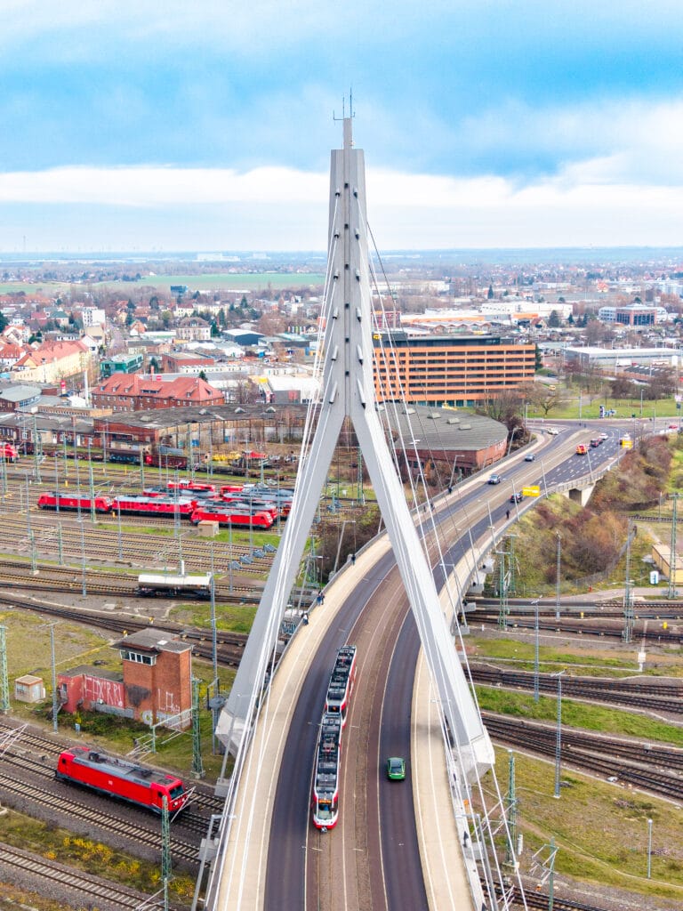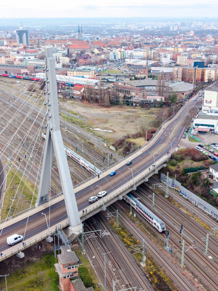 Vielleicht sehen wir uns ja bald wieder, auch wenn aus der Luft nicht so ganz viel zu erkennen war außer der beiden Warteschlangen: Eine vor der Kasse rechts, eine vor der Bratwurstbude links. Die Lünedrohne hatte auf eine prächtige Dampflok auf der Drehscheibe gehofft, aber die blieben in Halle lieber in der Halle (haha, sorry). Dafür rumpelte nebenan die modernste Zugbildungsanlage Europas.