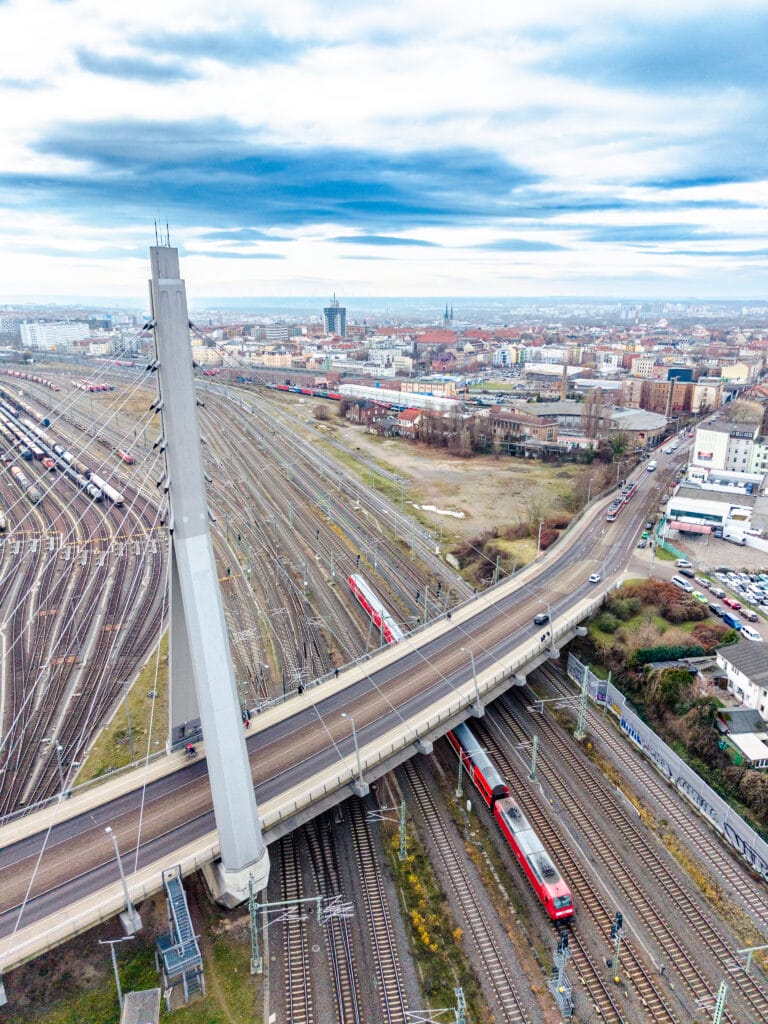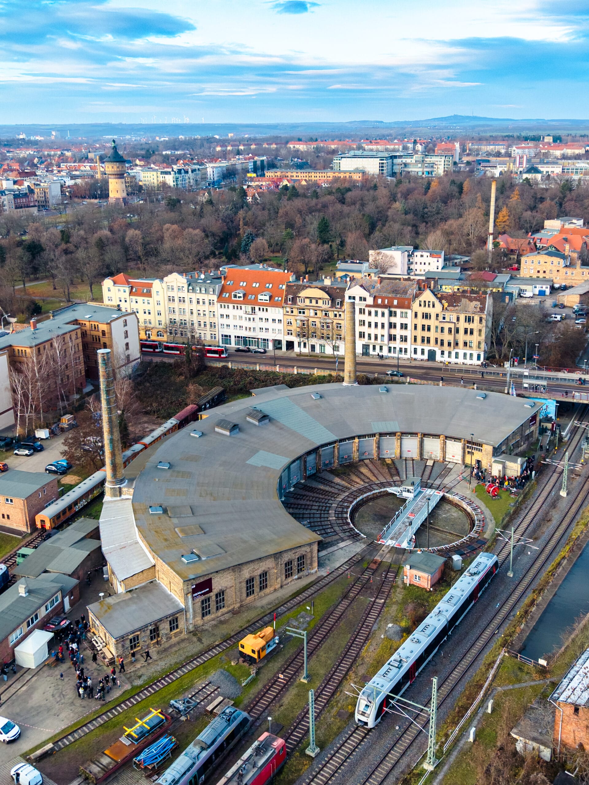 Ein paar schöne Züge als Vordergrund ließen sich lange bitten: Zwei ICEs hielten sich nicht an den Fahrplan und kamen deutlich früher in Halle an als geplant, die S-Bahn direkt vor dem Museum fiel aus, und als dann doch ein InterCity vorbeisauste, regnete es plötzlich.
