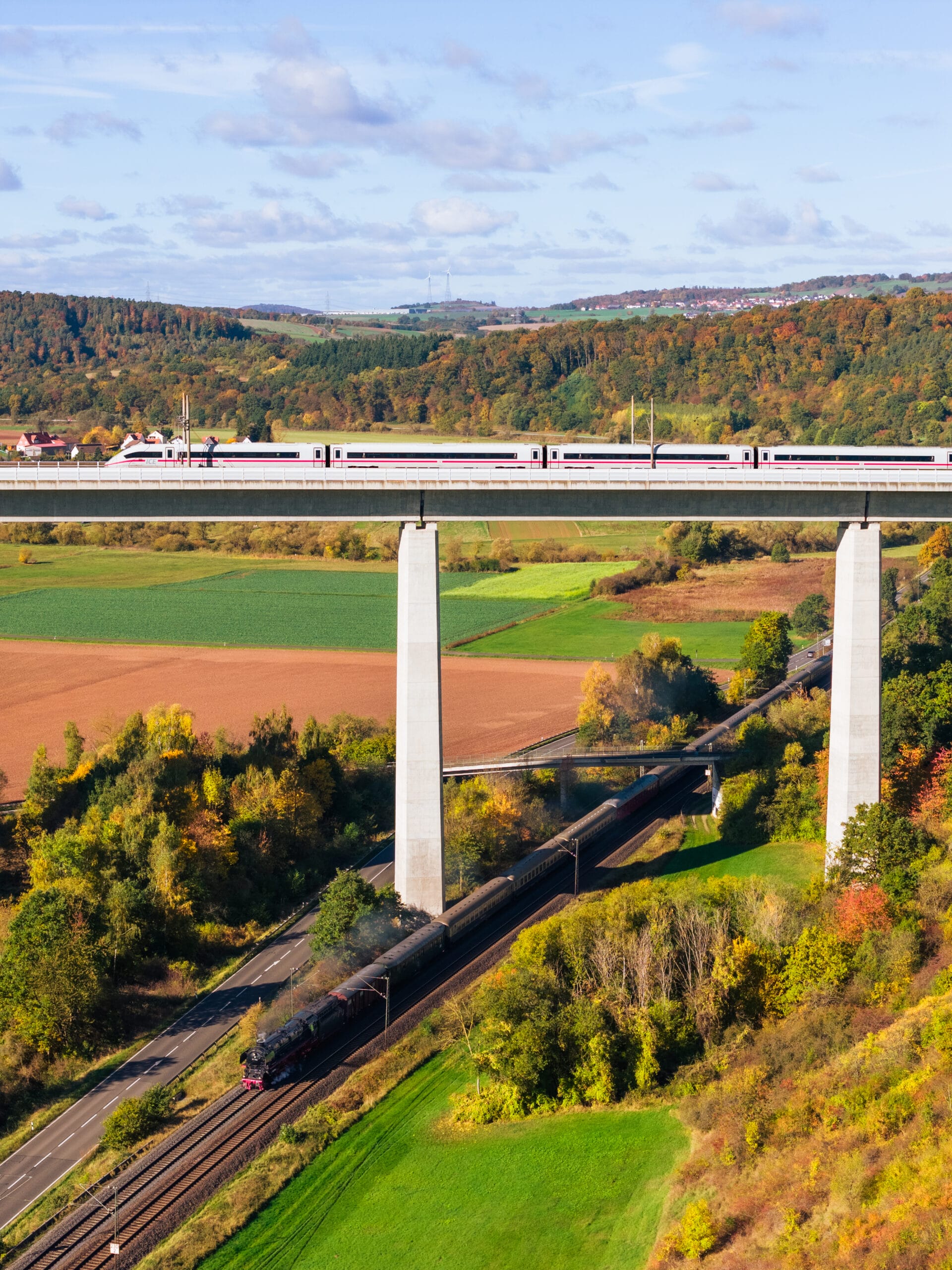 Wir warteten mit zwei Drohnen an der Fuldatalbrücke bei Morschen, die Differenz zwischen Temperatur und Taupunkt sollte ungefähr 3 K betragen und auch bei flacher Strecke für sichtbaren Dampf sorgen. Es blieb dann leider beim Wunschdenken, 012 104 düste mit einer dünnen Rauchfahne an uns vorbei. Immerhin konnte ich anschließend aus zwei Bildern diese leider in der Realität nicht stattgefunde Zugbegegnung zwischen der Dampfmaschine und dem ICE 535 zusammenbasteln: