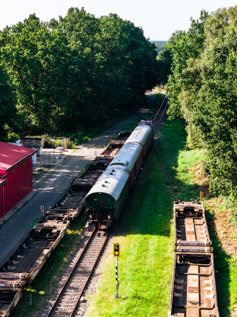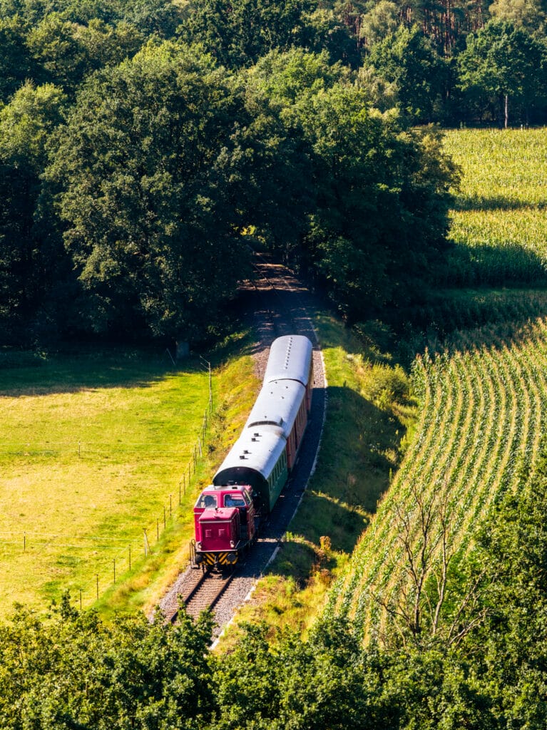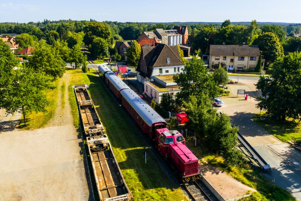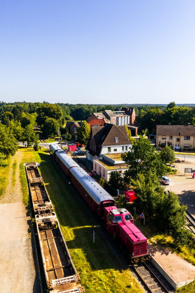 Bei schönstem Wetter in der Lüneburger Heide kann man auch mal einen Tag Urlaub nehmen, um alles zusammen auf einmal zu genießen. Los ging’s morgens mit dem Heide-Express von Lüneburg nach Bispingen, der hier noch weiter nach Soltau rollte: