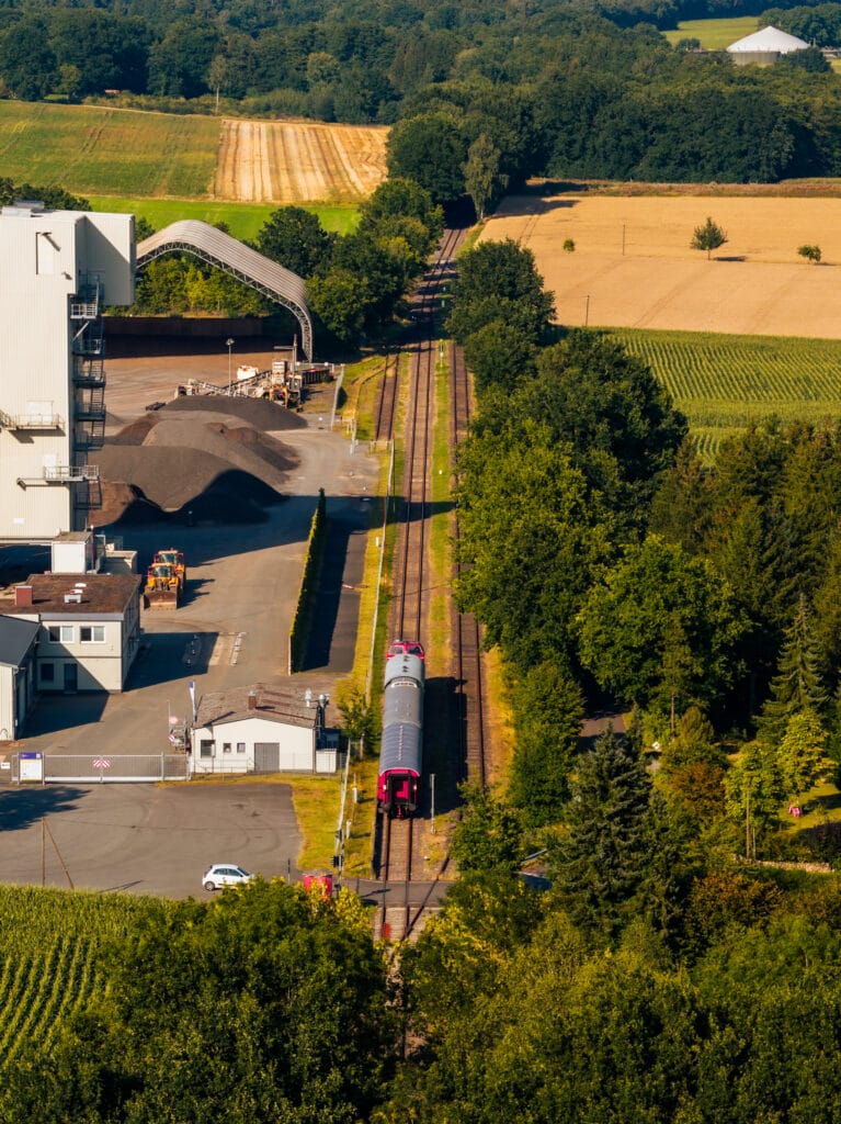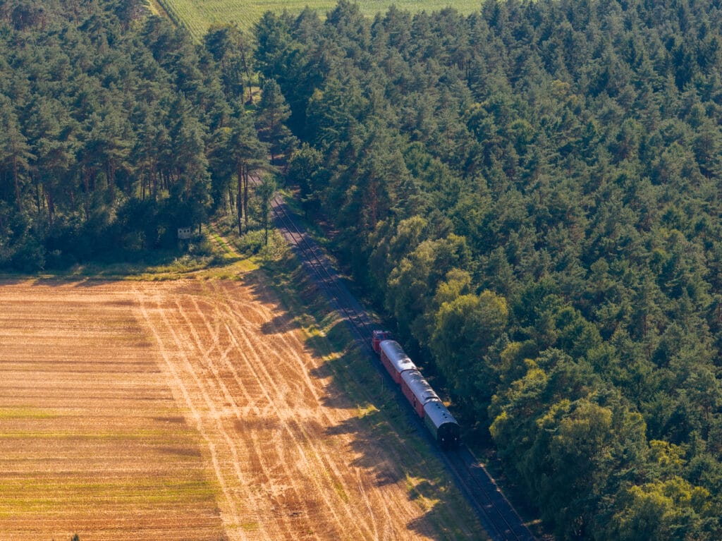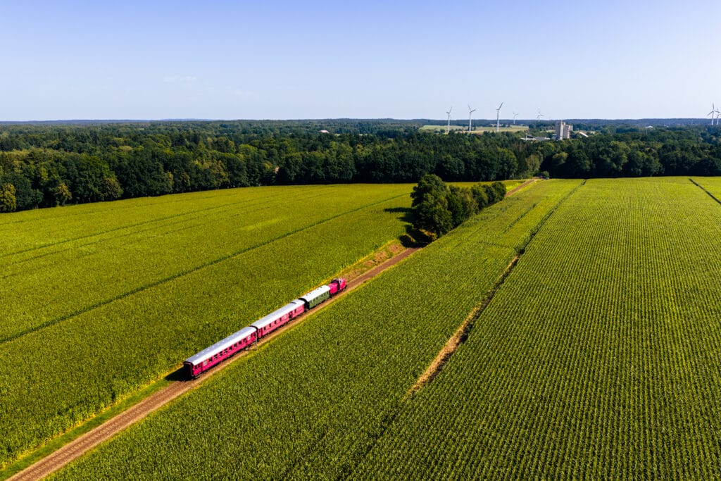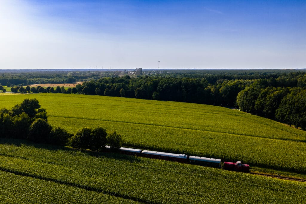 … und versinkt vor der Drohne im Maisfeld. Als ich vor einem Jahr dort flog, war das Feld schon gemäht, so dass vom Zug nicht nur das Dach rausguckte: