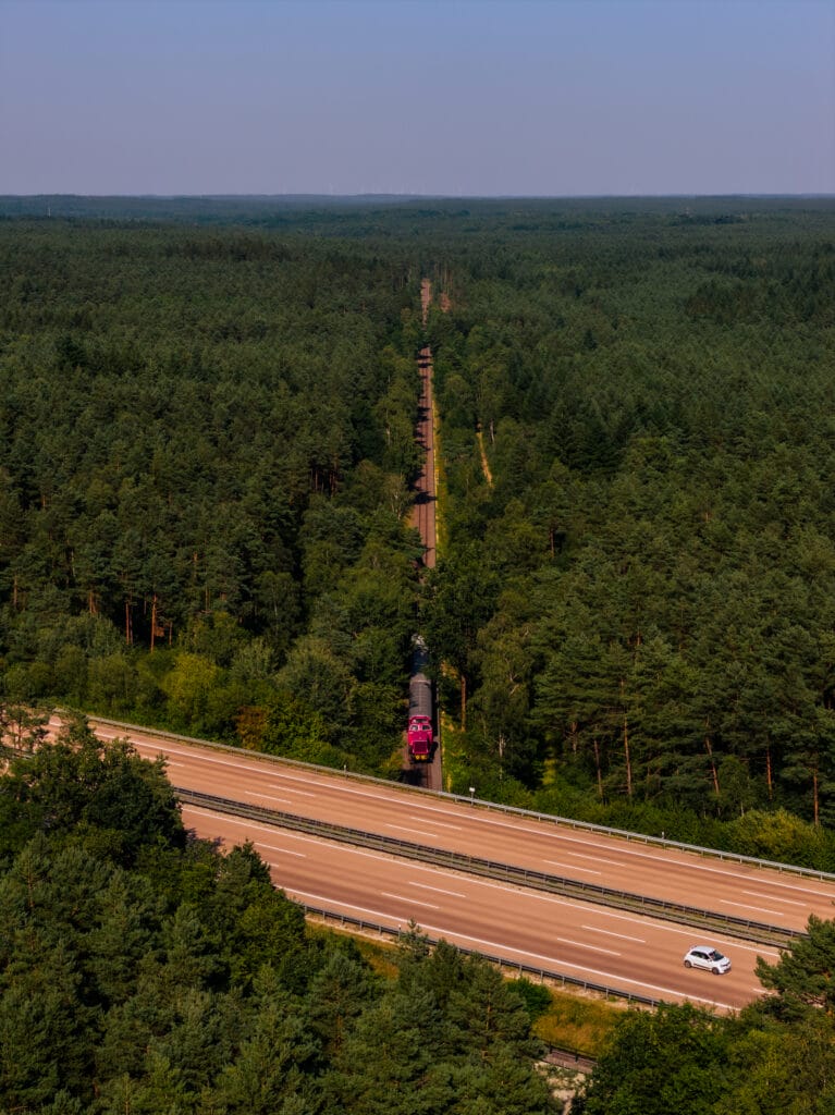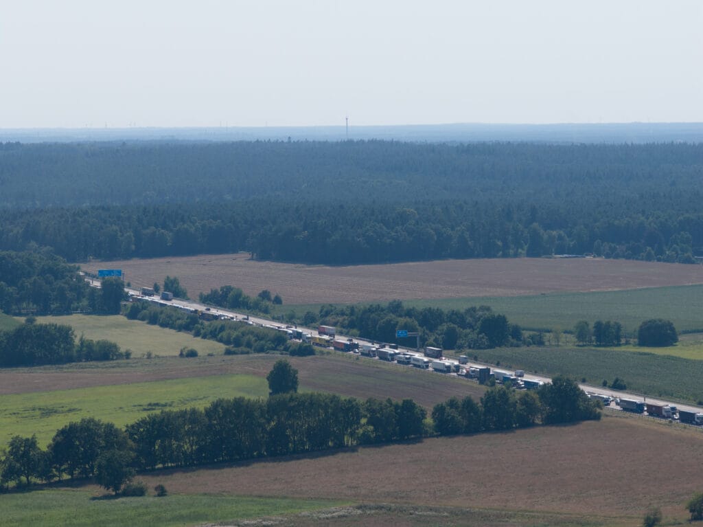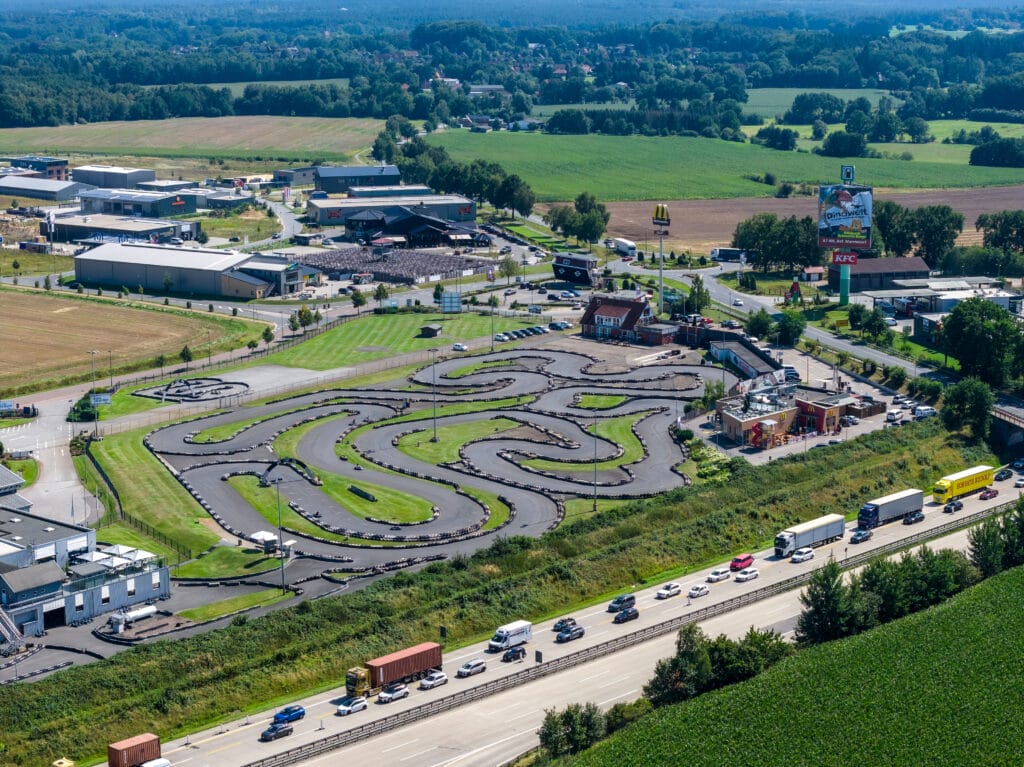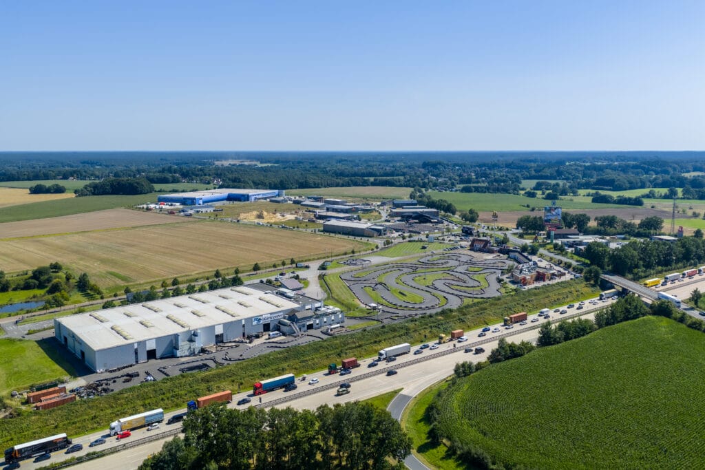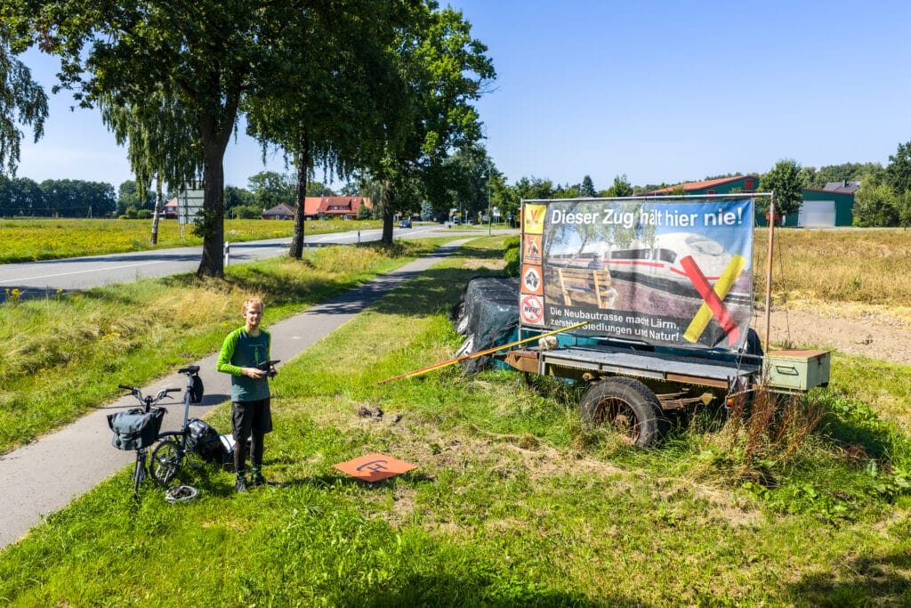 Weiter geht’s, beziehungsweise zurück geht’s nach Bispingen. Aber nur mit dem Rad, denn auf der Autobahn ist Stau und den Neubau der Eisenbahnstrecke Hannover–Hamburg will man hier nicht haben. Ein bisschen witzig war es schon, dass ich hier gerade ein Foto vor mir vor dem Protestplakat schoss, das unter anderem die Zerschneidung der Siedlungen und Zerstörung der Natur durch die Neubautrasse bemängelt, während sich direkt daneben der Kraftverkehr im Stau zusammenhupt. Und just als ich dort stand rief mich noch jemand zu Drohnenaufnahmen zur Neubautrasse an — die wiederum konnte ich wegen einer Terminkollision leider nicht liefern, aber Stau hätte ich gerade günstig im Angebot. Hier geht’s nur noch Richtung Süden oder im Kreis auf der Kartbahn: