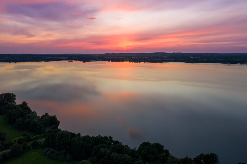 Die Sonne war an diesem schönen Augusttag noch immer nicht untergegangen, aber ich hatte nun leider wie ein Politiker oder Sportler den richtigen Moment zum Aufhören verpasst und steuerte noch einmal die Timmerloher Heide an, um von dort über die Autobahn hinüber den Sonnenuntergang zu fotografieren. Der brachte die drei Kamerasensoren der DJI Mavic 4 Pro nun allerdings gänzlich an ihre Grenzen; aus dem Bildmaterial konnte ich nichts schönes mehr herauskitzeln: