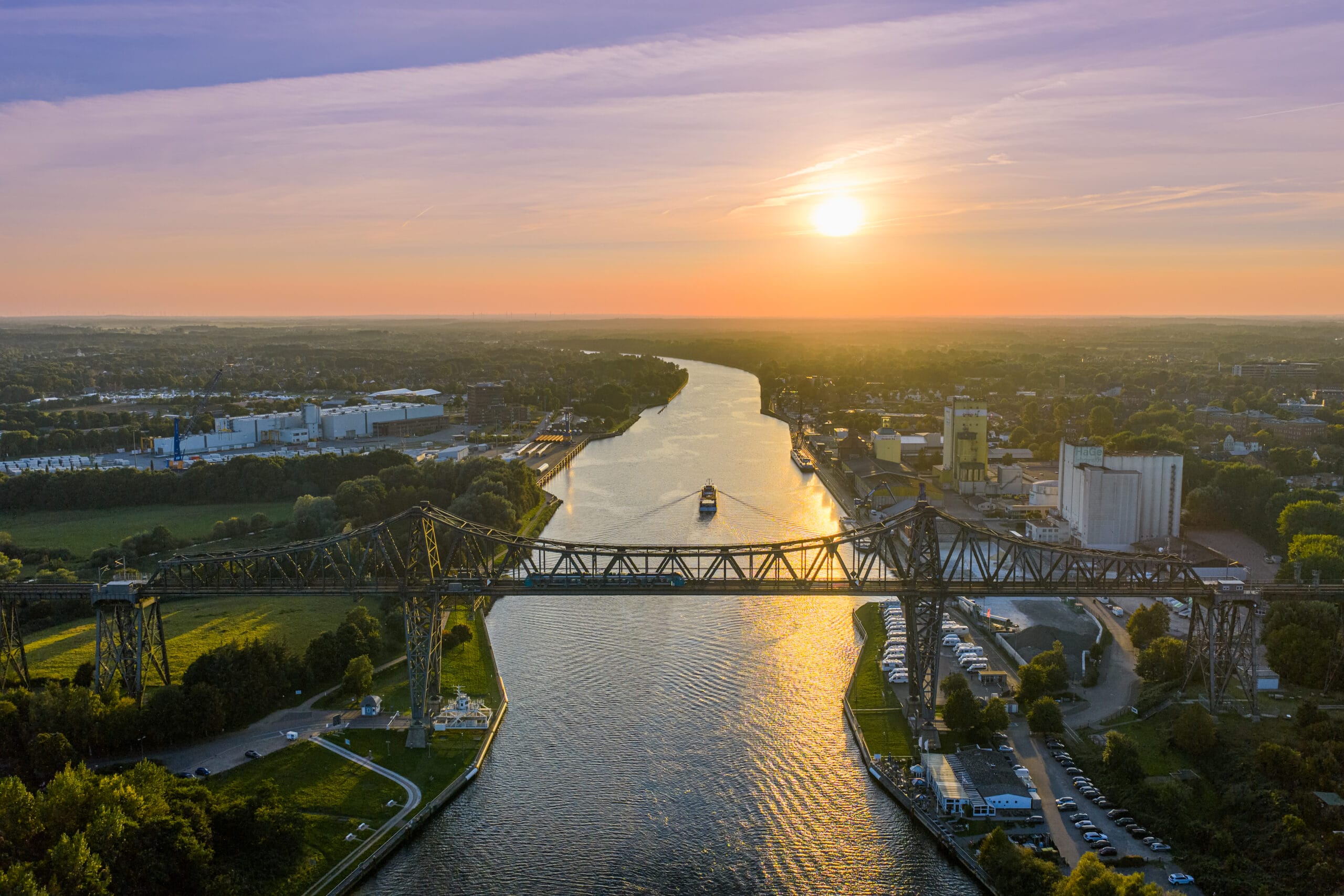 Rendsburg und dessen Eisenbahnhochbrücke liegen eigentlich für Drohnen unerreichbar in der Kontrollzone des Hohner Militärflugplatzes und obendrein ist mit dem Nord-Ostsee-Kanal noch eine Bundeswasserstraße im Weg. Und obwohl ich seit knapp zwei Jahren die notwendigen Genehmigungen habe, um auch hier fliegen zu dürfen, habe ich erst heute zum ersten Mal Gebrauch davon gemacht: Die Wettervorhersage versprach einen prächtigen Sonnenuntergang, der aber mit Adobe-Lightroom-Unterstützung erst schön wurde.
