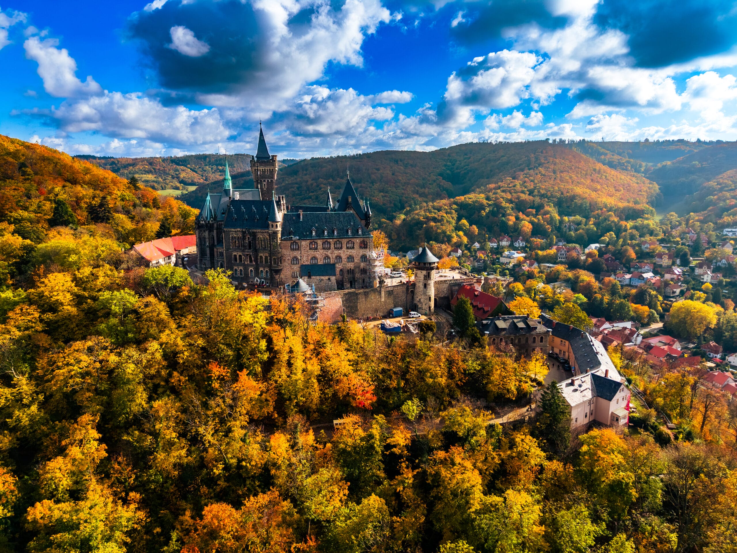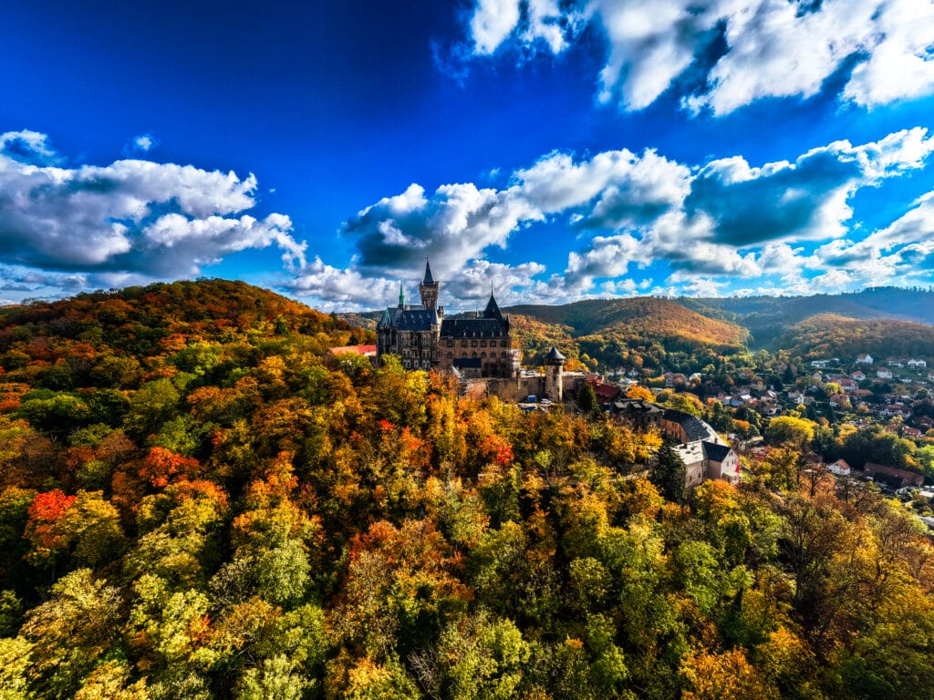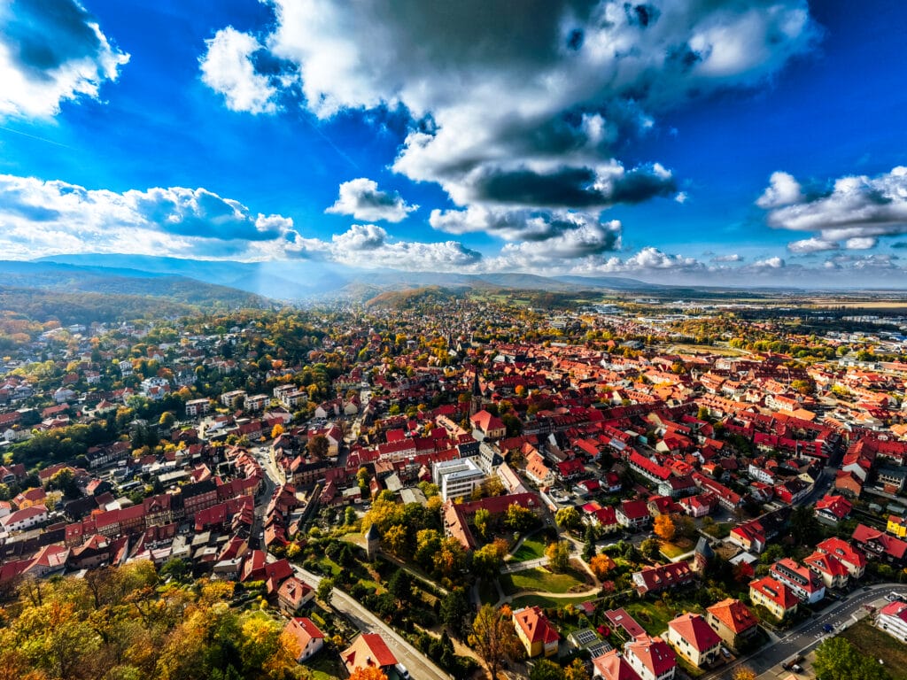Okay, wenn wir schon mal da sind, dann möchte sich die Lünedrohne natürlich auch das schöne Wernigeroder Schloss einmal ansehen, das hier der regnerischen Wettervorhersage trotzt und inmitten des goldenen Oktobers unter einem knallblauen Himmel oberhalb der Stadt thront.