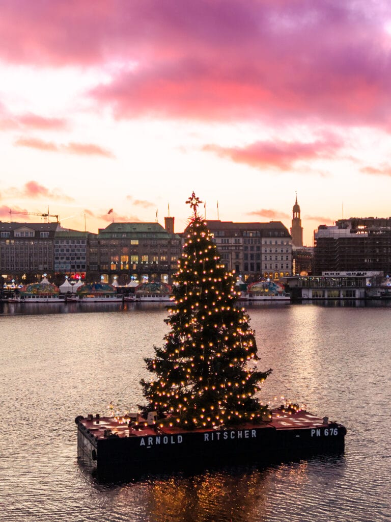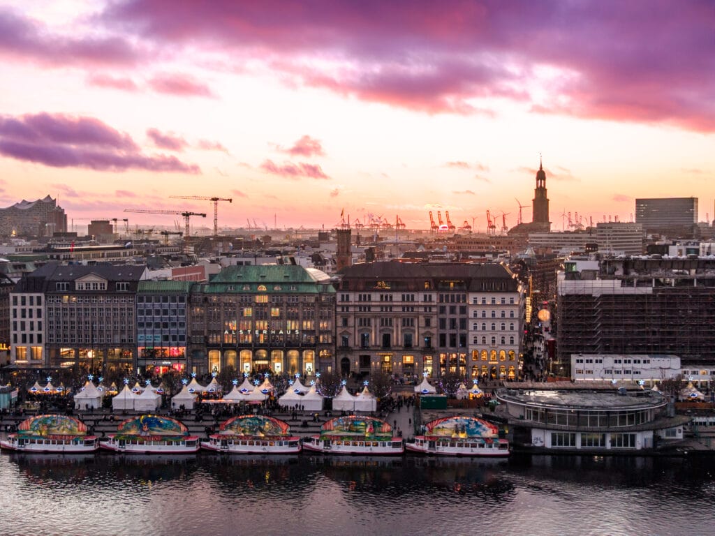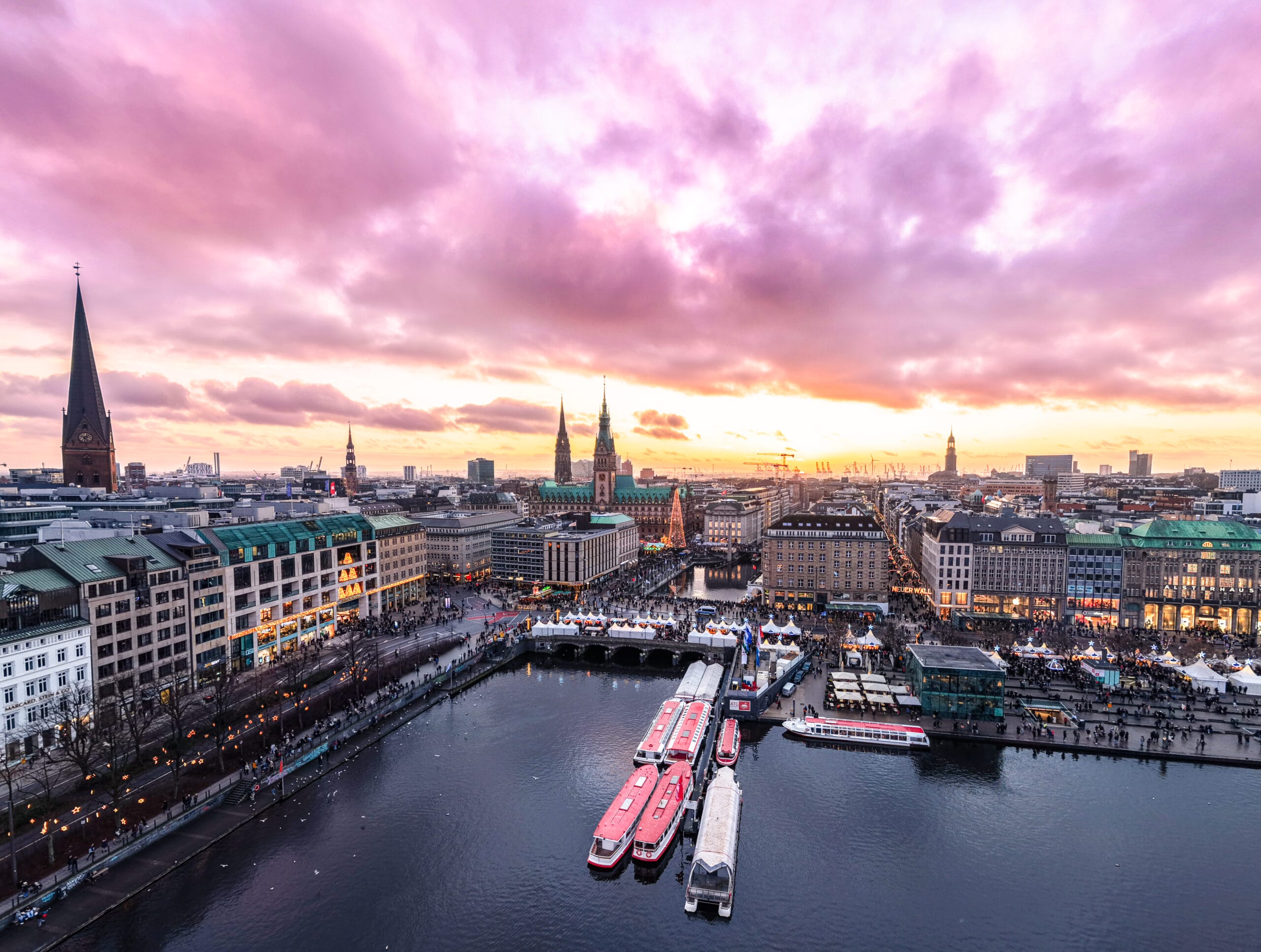 Nun hat es für die Lünedrohne doch noch den schönen Sonnenuntergang über dem Hamburger Weihnachtsmarkt gegeben. Und auch das war wieder knapp: In Lüneburg, der Heimatstadt der Lünedrohne, war es dermaßen voll, dass sich ein Drohnenflug in der Nähe des Weihnachtsmarktes angesichts der Menschenmassen verbot. In Hamburg gibt es aber mit der Binnenalster einen ausreichend großen Bereich, der Menschenansammlungen eher unverdächtig ist.